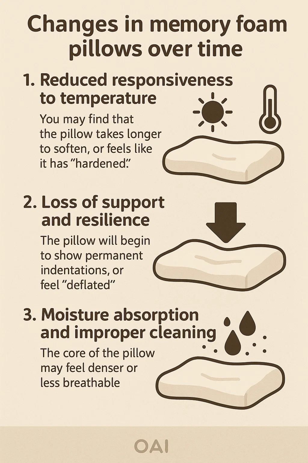 সময়ের সাথে সাথে বালিশ ব্যবহার করা হয়, মেমরি ফোম গঠনের জন্য ব্যবহৃত কিছু উপাদান ধীরে ধীরে বয়স হতে পারে। এটি শরীরের তাপমাত্রা এবং ঘরের তাপমাত্রায় একটি ধীর প্রতিক্রিয়া হতে পারে।
