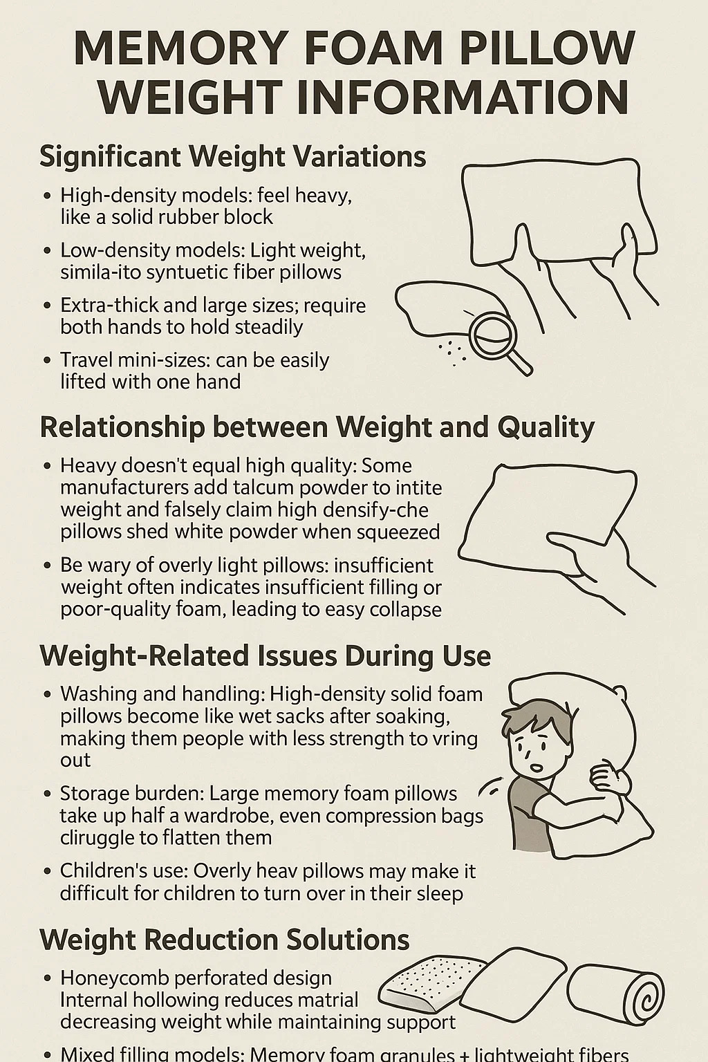ভারি উচ্চ মানের সমান নয়: কিছু নির্মাতারা ওজন বাড়াতে ট্যালকম পাউডার যোগ করে এবং উচ্চ ঘনত্বের মিথ্যা দাবি করে; এই বালিশগুলো চেপে দিলে সাদা পাউডার ঝরে যায়।