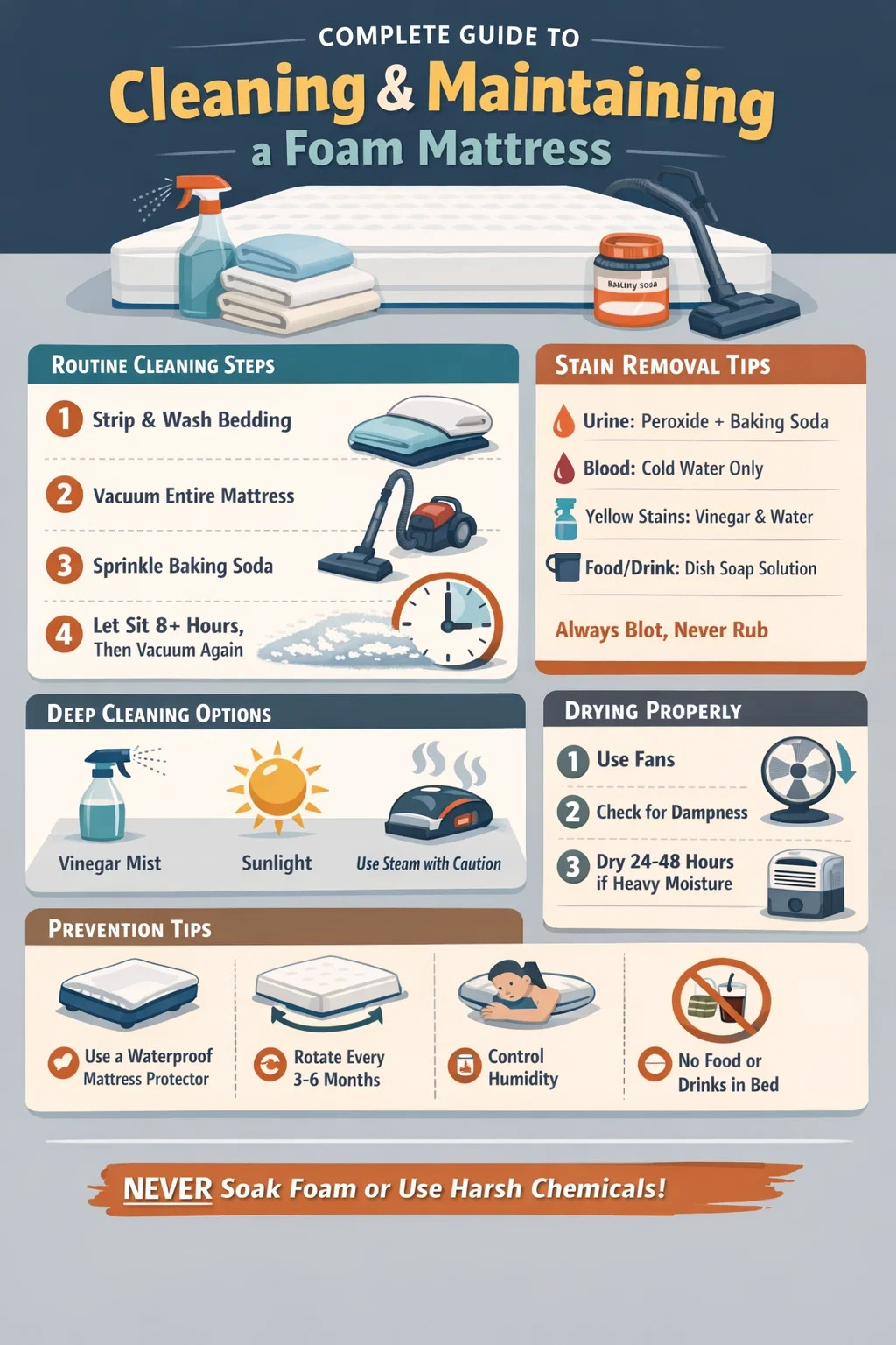 সেই মূল প্রক্রিয়াটি রুটিন রক্ষণাবেক্ষণের জন্য কাজ করে। কিন্তু ফোম ম্যাট্রেস - বিশেষত মেমরি ফোম ম্যাট্রেস - এর অনন্য বৈশিষ্ট্য রয়েছে যেগুলি জগাখিচুড়ির ধরন, দাগের বয়স এবং আপনি কত ঘন ঘন পরিষ্কার করবেন তার উপর নির্ভর করে নির্দিষ্ট কৌশল প্রয়োজন। নীচে আপনার যা জানা দরকার তার একটি পুঙ্খানুপুঙ্খ ভাঙ্গন।