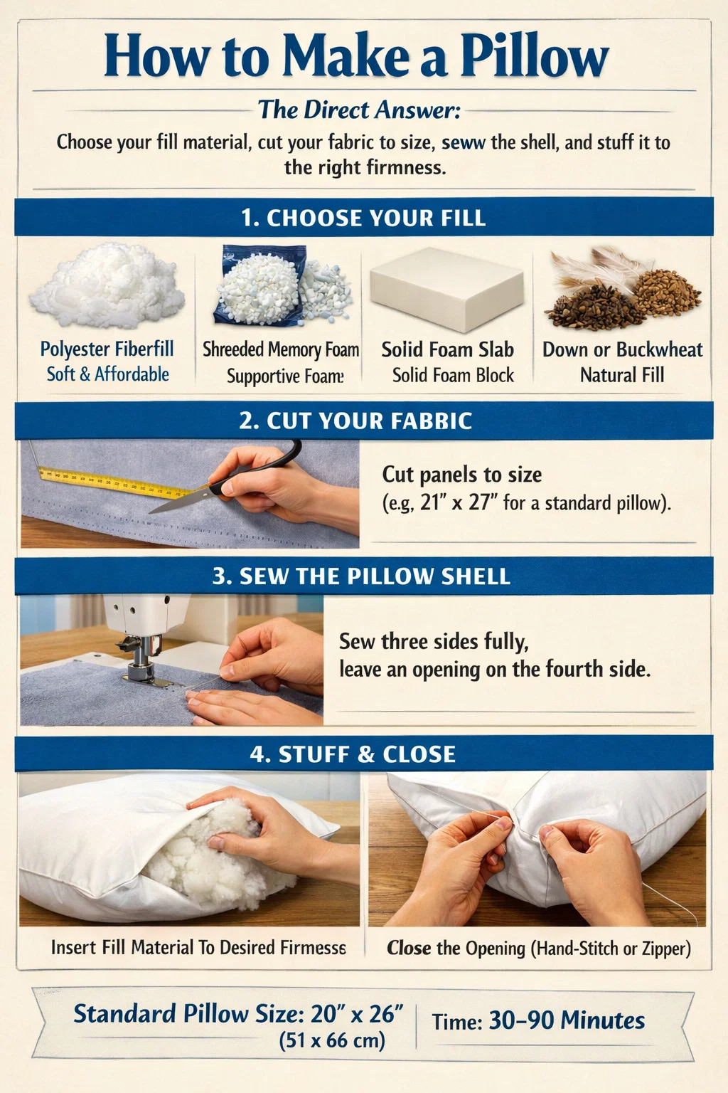 একটি বালিশ বানানোর চারটি মৌলিক বিষয় রয়েছে: আপনার ফিল ম্যাটেরিয়াল বেছে নিন, আপনার ফ্যাব্রিককে সাইজ অনুযায়ী কাটুন, শেলটি সেলাই করুন এবং সঠিক দৃঢ়তায় স্টাফ করুন। অধিকাংশ মানুষের জন্য, একটি আদর্শ বিছানা বালিশ পরিমাপ 20 × 26 ইঞ্চি (51 × 66 সেমি) , এবং পুরো প্রক্রিয়াটি-ফ্যাব্রিক কাটা থেকে চূড়ান্ত সীম বন্ধ করা পর্যন্ত-আপনার ফিল টাইপের উপর নির্ভর করে 30 থেকে 90 মিনিটের মধ্যে সময় নেয়। আপনি যদি মেমরি ফোম বালিশের সাথে কাজ করেন তবে প্রক্রিয়াটি কিছুটা আলাদা হয় কারণ আপনি আলগা ফাইবার দিয়ে পূরণ করার পরিবর্তে ফেনা কাটছেন বা ছেঁড়া করছেন, তবে কাঠামোগত পদ্ধতি একই থাকে।