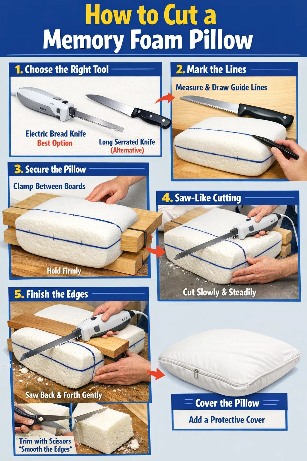 একটি মেমরি ফোম বালিশ কাটার জন্য নির্দিষ্ট পদক্ষেপ: