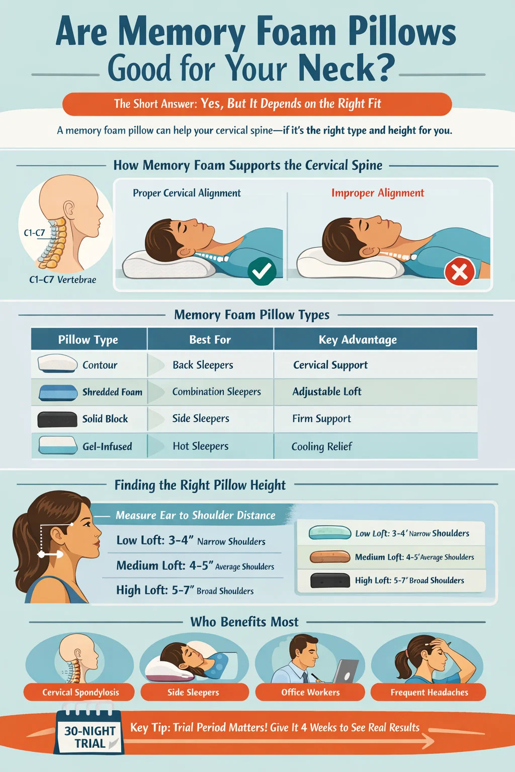 যদি এর মধ্যে তিনটি বা তার বেশি আপনার ক্ষেত্রে প্রযোজ্য হয়, তাহলে চিকিৎসা মূল্যায়ন করার আগে একটি সঠিকভাবে লাগানো মেমরি ফোম বালিশের পরীক্ষা করা একটি যুক্তিসঙ্গত প্রথম পদক্ষেপ, কারণ বালিশ-সম্পর্কিত সার্ভিকাল সমস্যাগুলি প্রাথমিকভাবে ধরা পড়লে হস্তক্ষেপ ছাড়াই অত্যন্ত সংশোধনযোগ্য।