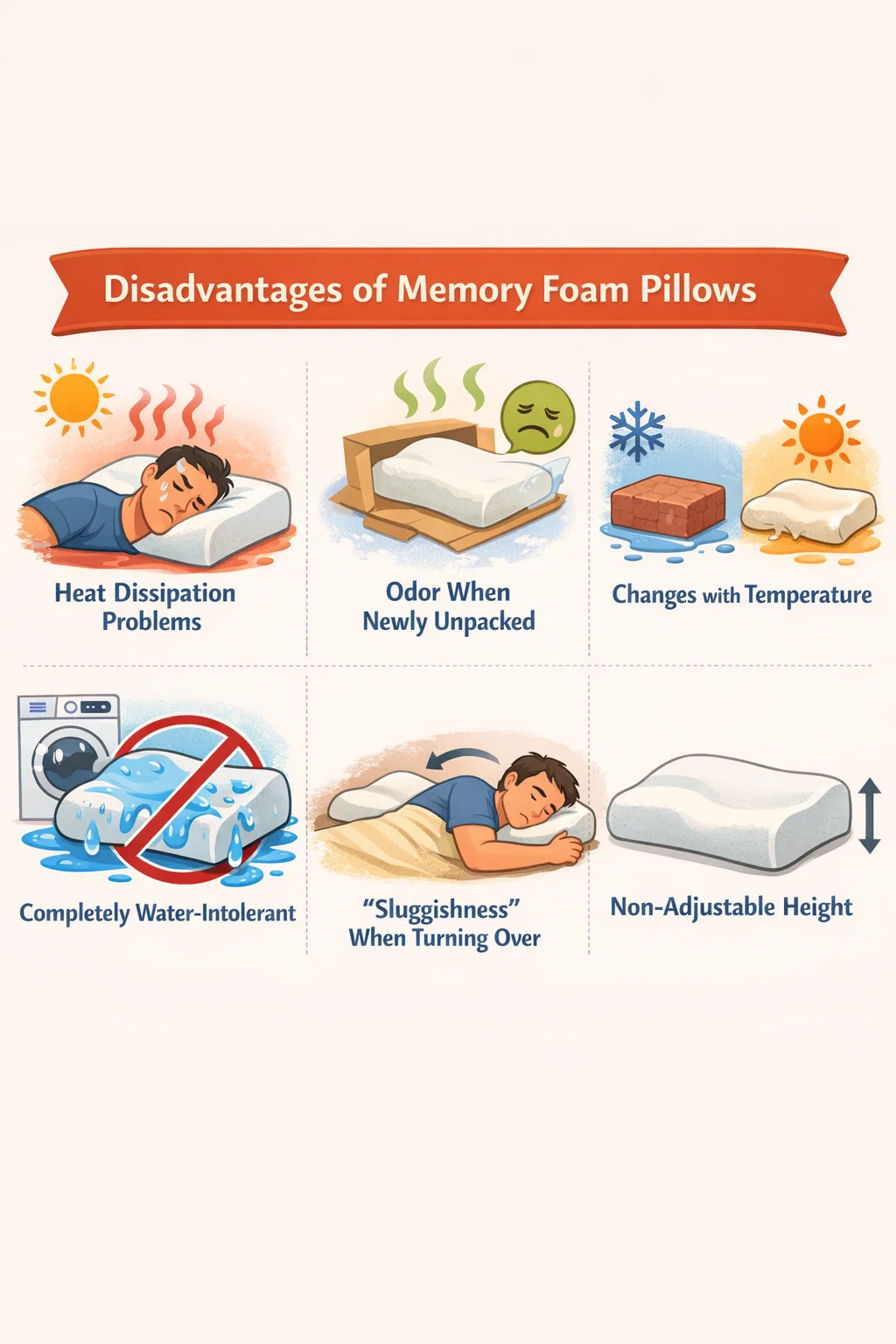 যদিও মেমরি ফোম বালিশ তাদের আরাম এবং ঘাড় সমর্থন জন্য বিখ্যাত, তারা নিখুঁত নয়. প্রতিটি ব্যক্তির ঘুমের অভ্যাসের জন্য, এই বালিশগুলির কিছু বিরক্তিকর ত্রুটি রয়েছে।